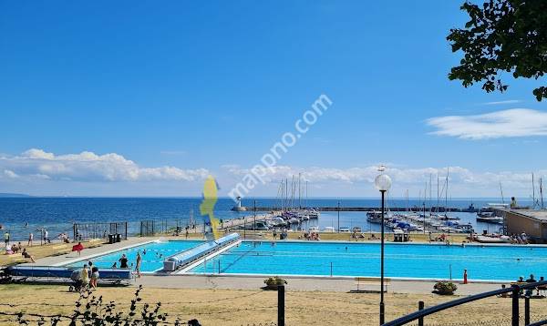 Fantastic swimming area with both pools and beach swimming. Nice and clean, clear and pure water. There are changing rooms and toilets. Close to restaurants and cafes. Free admission.