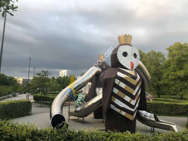 What a cool playground! The giant owl slides were really fun and my kids enjoyed playing there, in the bugs, and in the big flowers. Things would be much better if there was a good bathroom nearby. We had a diaper issue and the one public bathroom across from the train station was filthy. The grocery store on the corner did not have one so we had to leave before we wanted to in order to find a good bathroom.