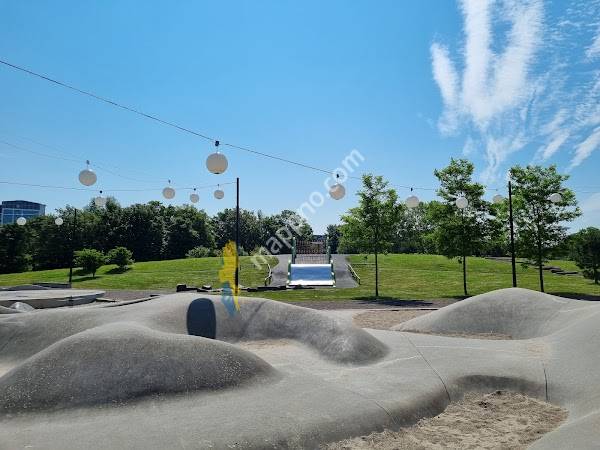 Fun place to take kids. There are swings although they're kinda small, but maybe that's just because I'm a pretty big guy. There's a climbing frame that's next to a big slide. There are multiple logs sticking out of the ground, bouncing plates and rocks to jump on for parkour. There's a sandpit that has a bunch of seesaw thingies in it. There's also one of those rods you grab onto and pull yourself up to train, but it's off-limits for some reason. There's a weird gray climbing thing next to the sandpit. Finally, there is also a big water spring fountain for kids to run on and get soaked, which turns on during the summer or spring, I think. And yes, there are benches to sit on in case you were wondering. I also forgot about the small football field, but you'll need to bring your own ball if you want to play there.