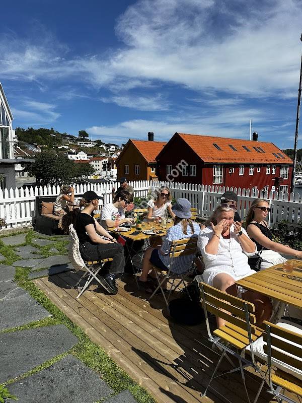 Grimstads fineste utested. Utsikt til havet og masse sol. Eneste problemet er måker og spurv plager deg konstant. Veldig slitsomt. Det ødelegger litt av opplevelsen her, må hele tiden passe på at de ikke hakker løs på maten din. V