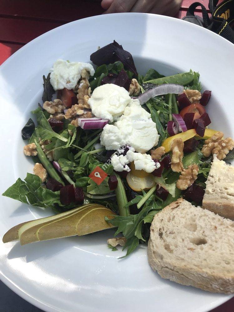 Meget flott uteservering i unike omgivelser. Koselig inne er det også. Enkel og grei meny samt øl og vin. Soloen var kald, vafflene sprø og kaffen utmerket. For den som er slik anlagte kan du hente askebeger inne og ta med ut.