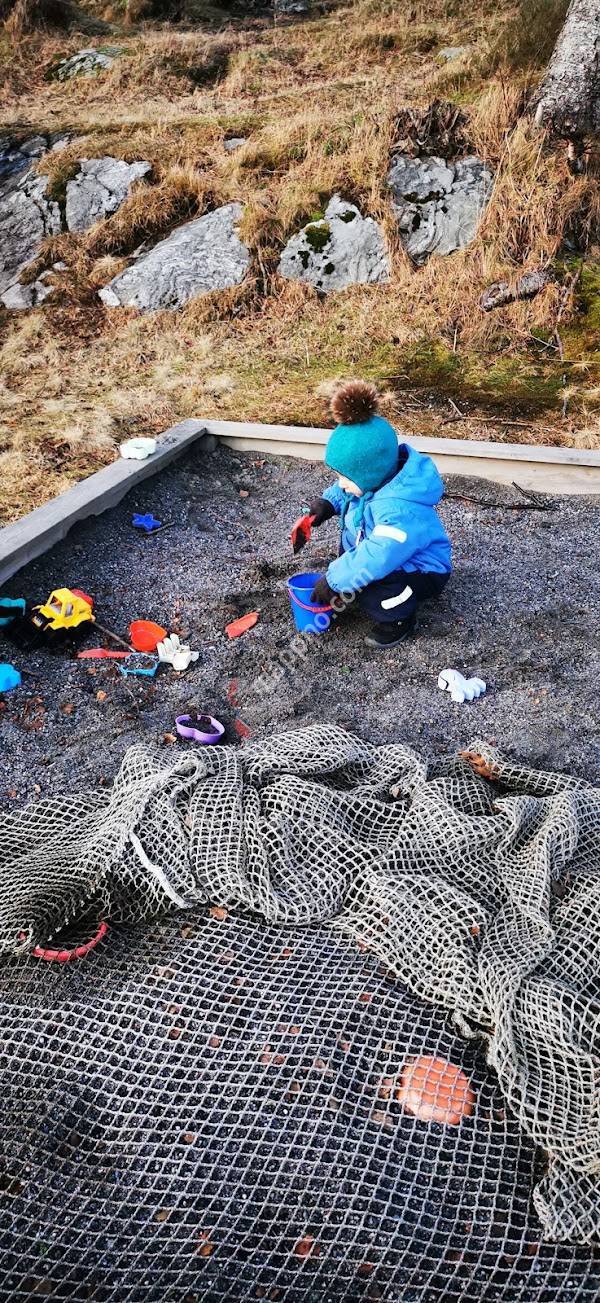 Har et greit lekestativ med en rusjebane, en ganske stor sandkasse med en gravemaskin...